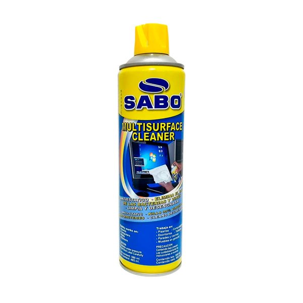 - Agite la lata antes de usar. Evite rociar la espuma directamente a las pantallas, teclados. Hágalo primero sobre una wipe SABO de 6 a 8 pulgadas de distancia y con movimientos horizontales de arriba a abajo permitiendo que trabaje la espuma.